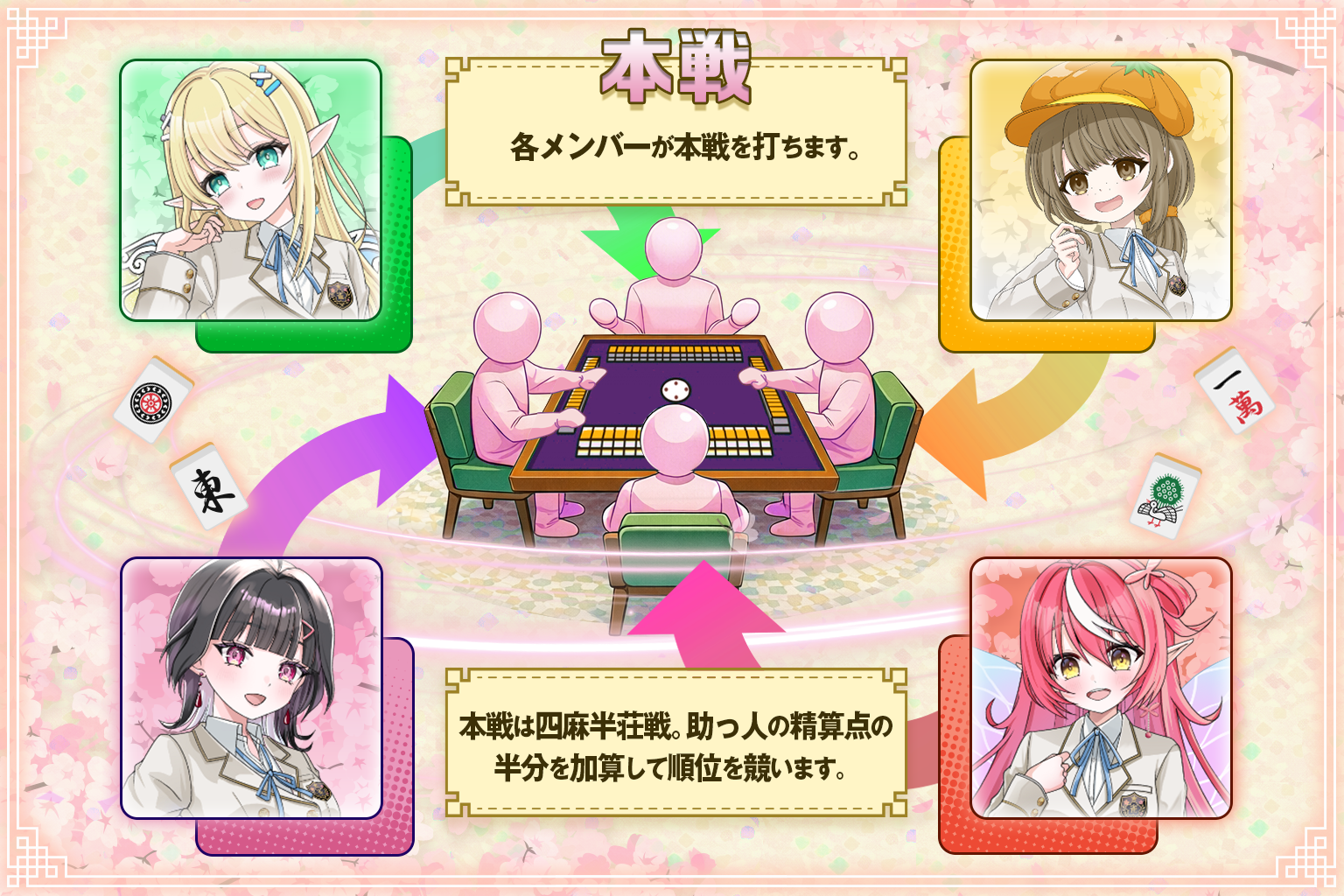 メンバー同士で本戦を打ち、助っ人との合計ポイントで順位を競います。